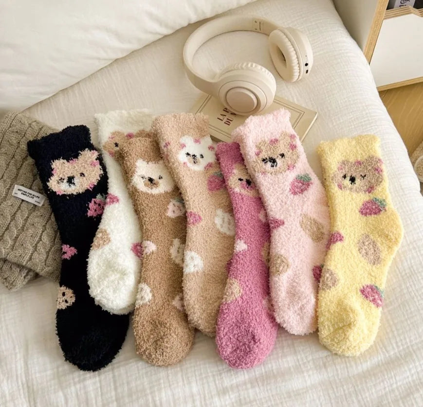 New Fashion Coral Fleece Women Socks Warm Home Floor Socks Strawberry Bear Socks Mid Tube Sleep Socks Plush Socks Added Fleece
