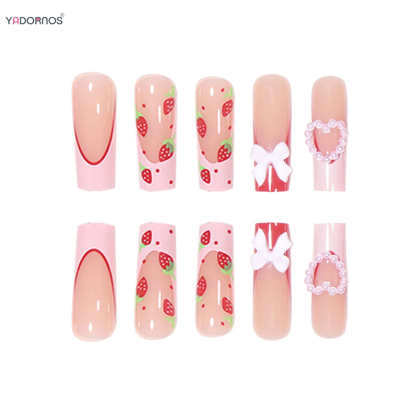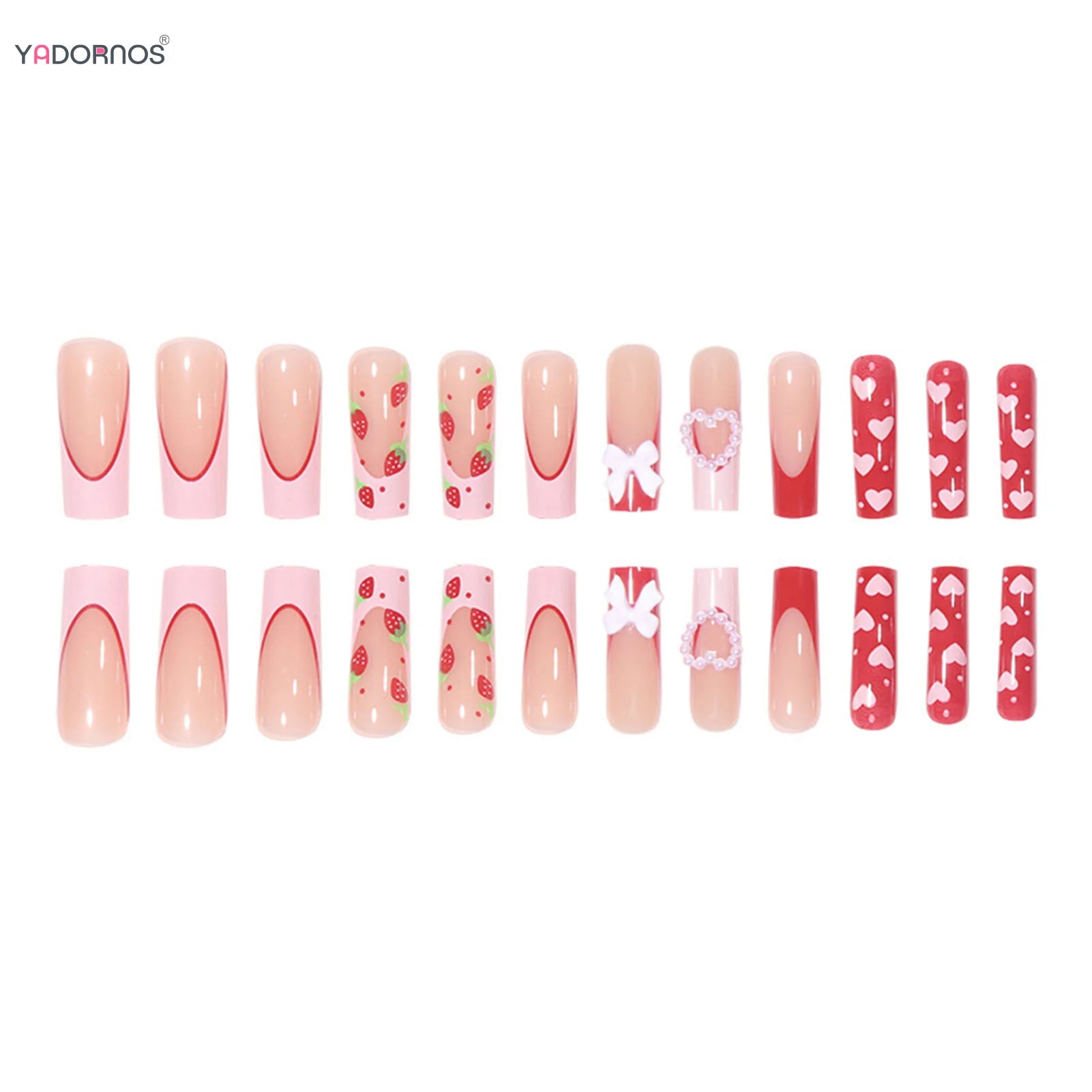 Red Strawberry Fake Nails Long Coffin French Press on Nails Pink Love Heart 3D Bowknot Designs False Nails for Women Girls 24Pcs